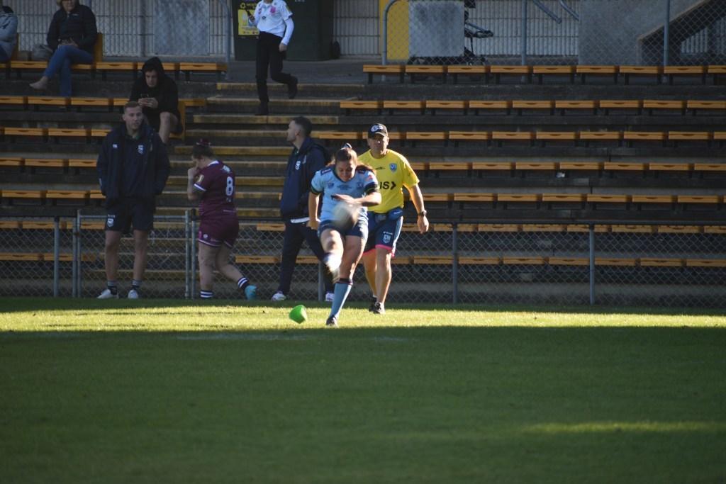 They didn’t have to wait long, however, after three NSW defenders drove the Queensland ball-carrier back over their own try line for a line drop out, which NSW immediately took full advantage of and a few plays later NSW replacement Bianca White scored to make it an 8-4 ball game to NSW.
