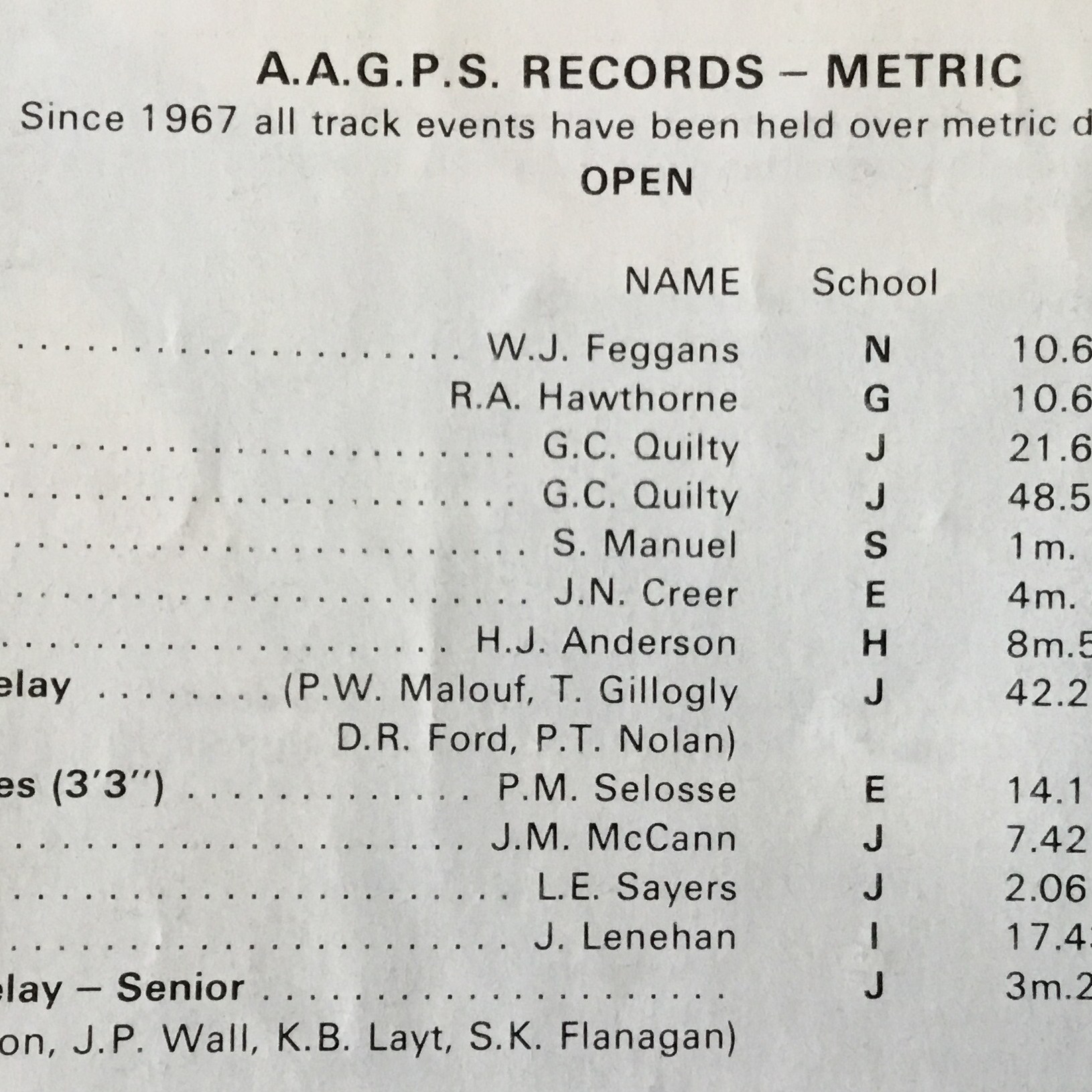 By school’s end I’d run so well; I ran myself into two Senior Athletic Teams; two winning 4 x 400 metre relay teams and a AAGPS record to boot. I played in the Third XV and a few years after leaving school I briefly played first grade for Eastern Suburbs Rugby club.