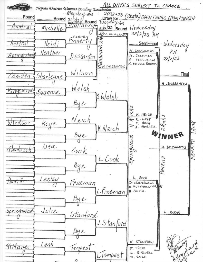 District semi-final team and winners photos with progressive draw through the rounds are below (photos courtesy of Ian Tempest and draw information from Nepean Ladies Bowls Facebook page). Feature image: Caroline Layt