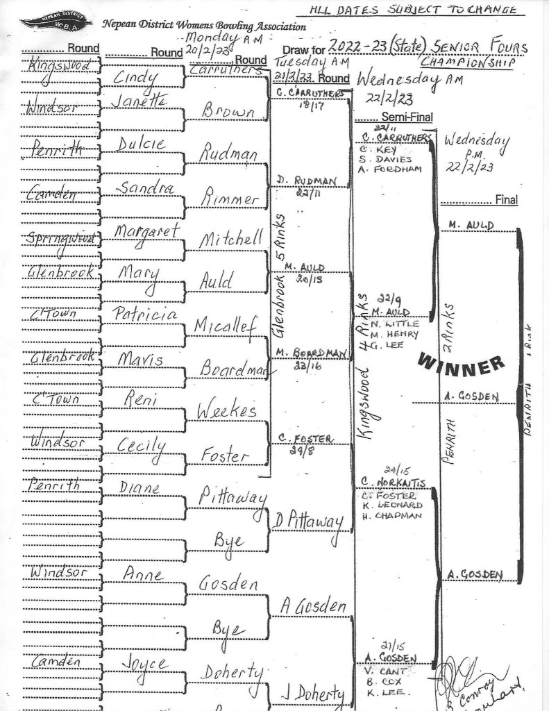 Earlier in the day they’d easily accounted for their own Windsor club-mates in Helen Chapman, Kay Leonard, Cecily Foster and Chris Norkaitis by 30-8 in their all-Windsor semi-final, while the Glenbrook team accounted for Cindy Caruthers team from Kingswood.